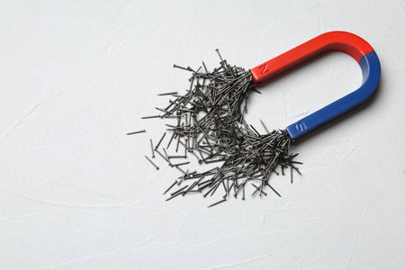 Magnet attracting nails on light background, top view with space for text
