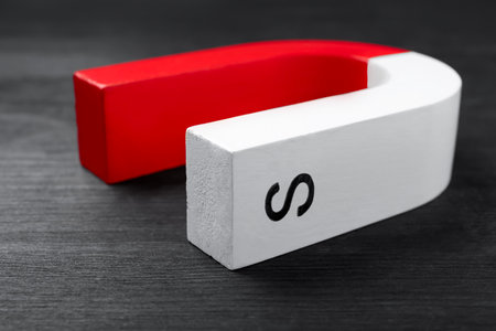 One horseshoe magnet on black wooden table, closeup