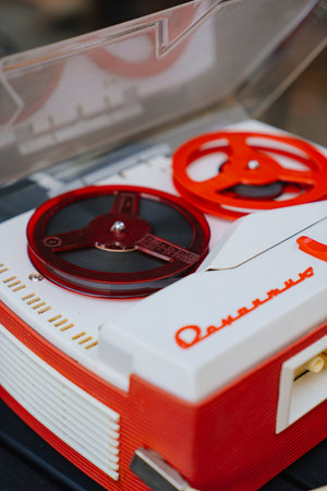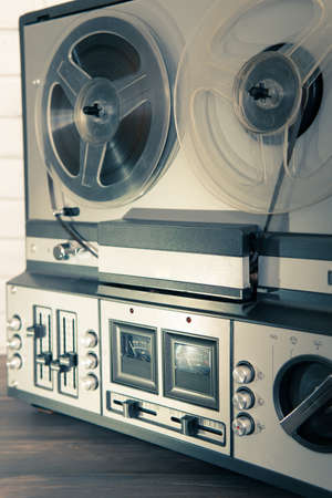 vintage tape recorder with coils of magnetic tape. soft selective focus with small depth of field