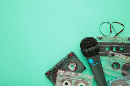 Microphone and cassette on mint background. Top view