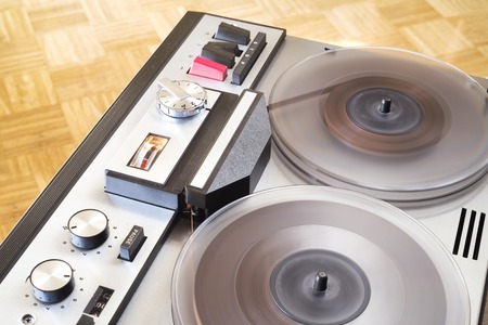 vintage open reel tape recorder in full operation, close up