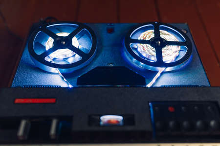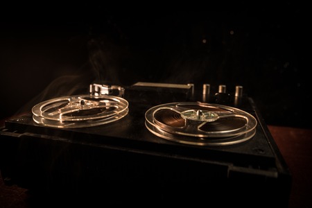 Old vintage reel to reel player and recorder on dark toned foggy background. Analog Stereo Open Reel Tape Deck Recorder Player with Reels. Selective focus