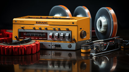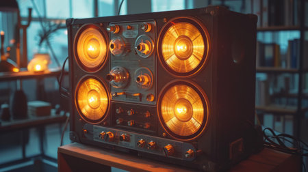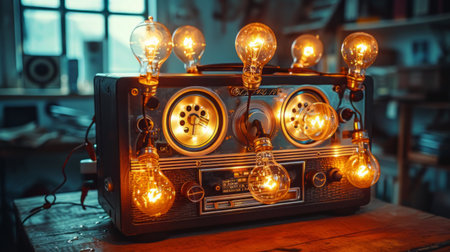 Vintage tape recorder embellished with numerous glowing light bulbs, casting a warm and nostalgic glow Generative AI