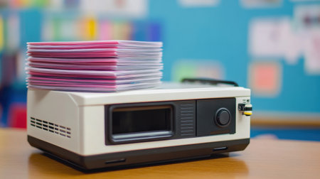 A vintage projector sits on a desk with colorful stacks of paper nearby, perfect for presentations and educational activities in a bright classroom environment.