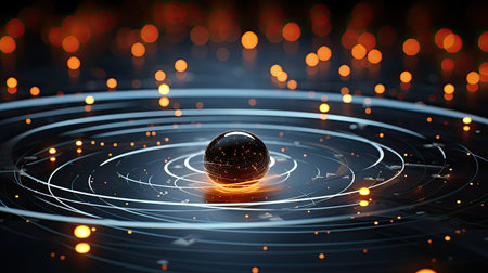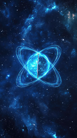 An illustration presents a glowing energy core, possibly representing a scientific concept. The artwork features a dark blue, starry background and luminous blue lines forming an orbital pattern. This image can be applied for various commercial and editorial applications, showcasing a visually captivating design.
