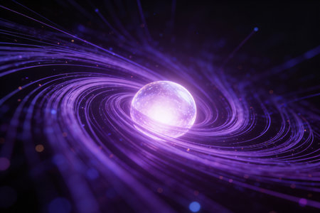 Vortex of light trails and neon motion streaks, purple and electric blue glowing swirl in futuristic style