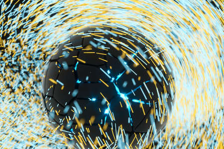 Glowing sphere with intricate mesh structures is surrounded by swirling blue and orange light, creating dynamic and futuristic atmosphere