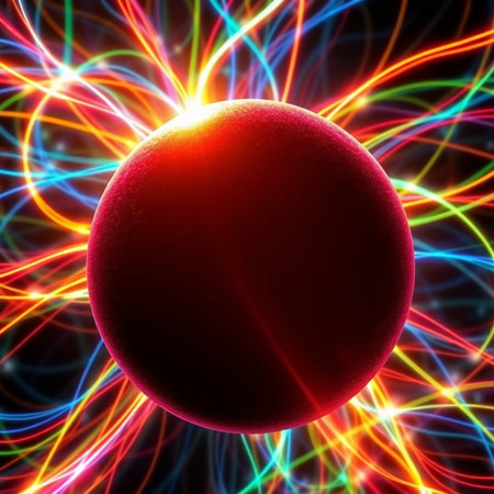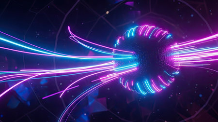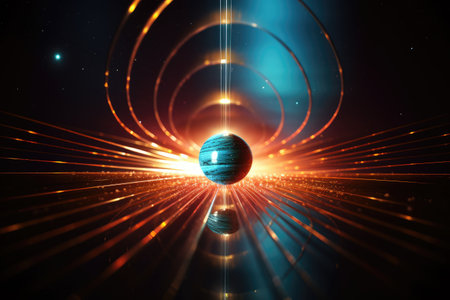 An abstract illustration features a glowing sphere at its center, encircled by vibrant, flowing rings of light that create a dynamic and mesmerizing visual, suggesting themes of science, technology, and energy.