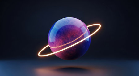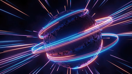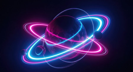 3D illustration of a planet surrounded by neon lights with a ring in the center
