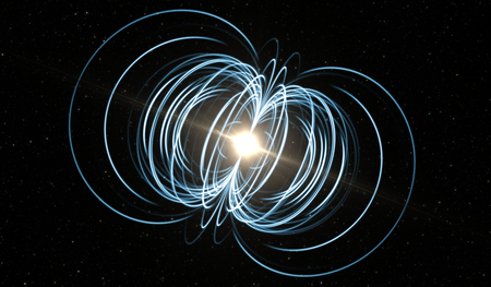 A scientific illustration of a magnetar, a type of neutron star with an extremely powerful magnetic field, in deep space. Complex magnetic field lines, shown in orange and white, loop and emanate from the star's poles. This image represents concepts in astrophysics, astronomy, and the extreme physics of celestial objects.