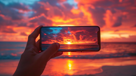 A hand holds a smartphone capturing the stunning view of a vibrant sunset over the ocean horizon on a tranquil beach.
