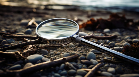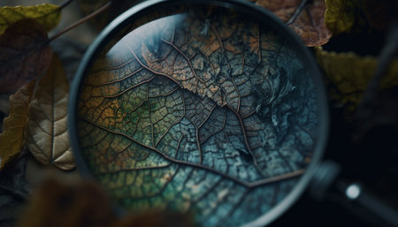 A magnifying lens sitting on top of a pile of leaves. Generative AI image.