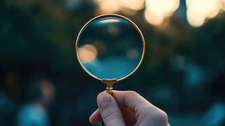 Close-up of a hand holding a magnifying glass, symbolizing focus and the quest for discovery in a blurred background.
