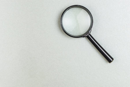 A magnifying glass rests on a smooth gray surface, highlighting details and inviting curiosity about the small elements around it in a quiet setting.