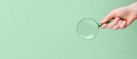 Banner with hand holding magnifying glass. Information search, key words finding, data analysis and verification concept. Copy space on green background in eco-friendly style. High quality photo