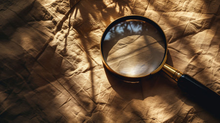 Magnifying glass resting on a rustic surface, soft natural tones filling the frame