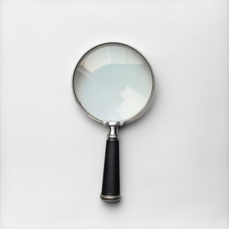 A handheld magnifying glass with a sleek black handle rests on a smooth white surface, highlighting its glass lens, designed for detailed observation of tiny items and documents.