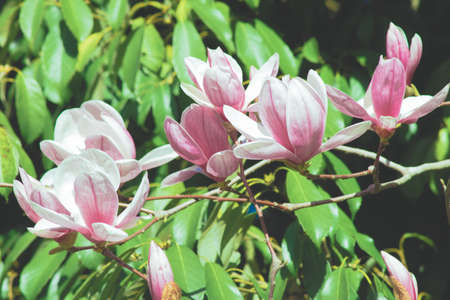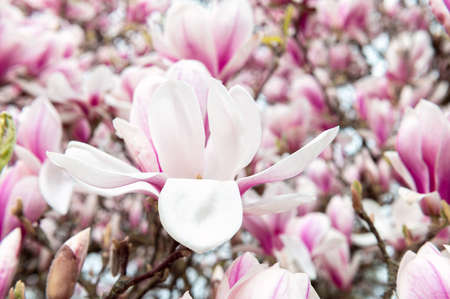 Magnolia soulangeana also called saucer magnolia flowering springtime tree with beautiful pink white flowers March.