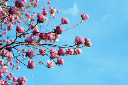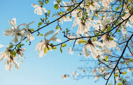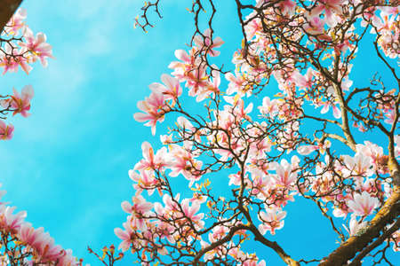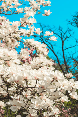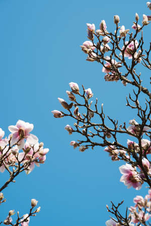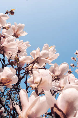 Blossoming of magnolia flowers in spring time against bright blue sky