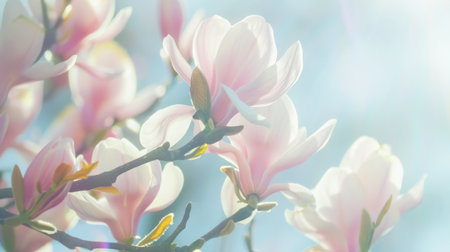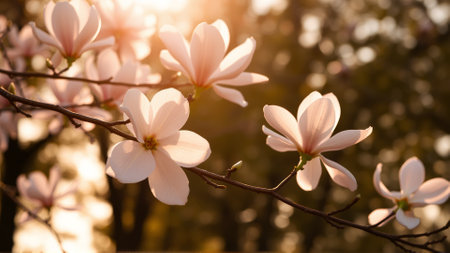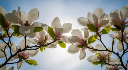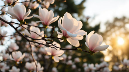 Graceful Magnolia Blossoms Illuminated by Soft, Spring Sunlight