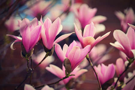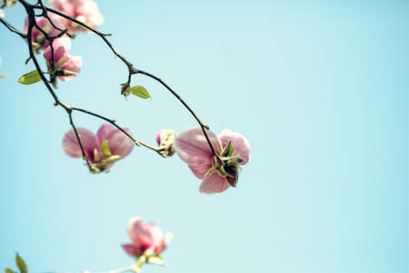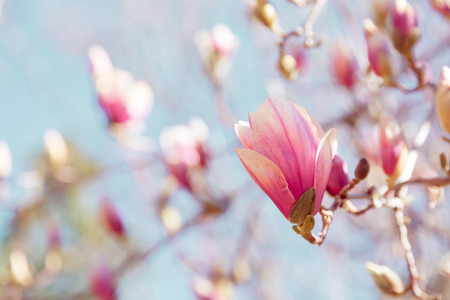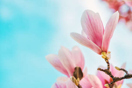 Beautiful floral concept. Pink magnolias in a spring edition. Photo with shallow depth of field.