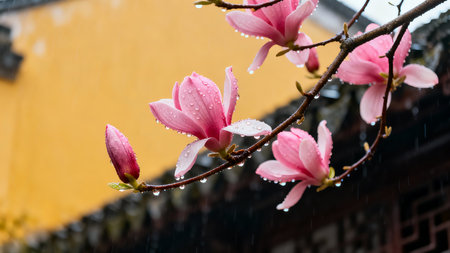 Pink magnolia flowers with raindrops on the background of yellow wall