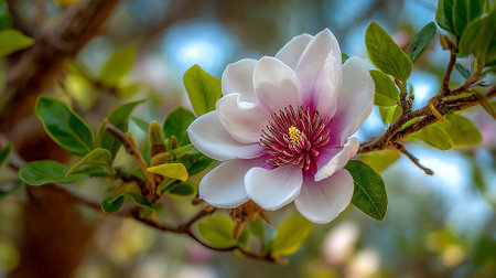 Delicate Magnolia Blossom with Branches Against a Blurred Background.