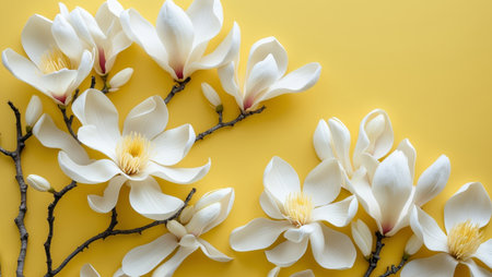 AI Generated. Elegant magnolia flowers arranged on a vibrant yellow background for a cheerful spring vibe