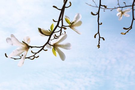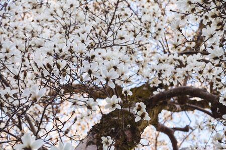 Beautiful blooming magnolia branches with open flowers. White chinese magnolia with tulip flowers in spring garden. Botanical Garden in May.
