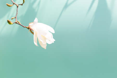 White blooming magnolia on turquoise background, shadows. Spring. Perfect for your design. Front view, copy space, space for text. Selective focus.