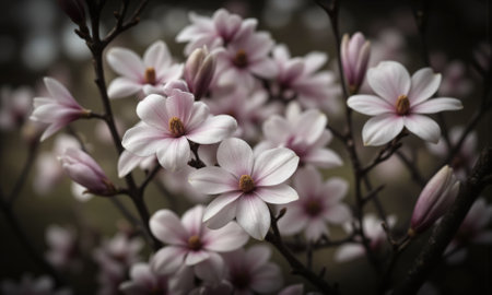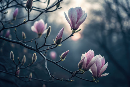 Magnolia flowers display their soft pink petals on branches in a moody setting. The early morning light creates a serene ambience, with a dark, blurred background enhancing their beauty.