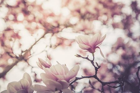 A sunny day with blooming pink magnolia flowers in the background of a mysterious spring floral background.