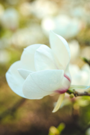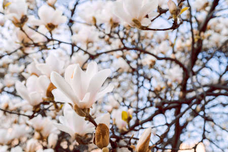 Beautiful magnolia tree blossoms in springtime. Jentle white magnolia flower against sunset light. Romantic floral background..