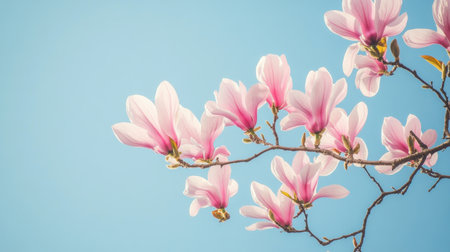 A stunning display of pink magnolia flowers against a clear blue sky, capturing the essence of spring with elegance and natural beauty in a harmonious setting.