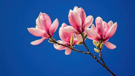 Stunning magnolia flowers with pink petals bloom against a clear blue sky, capturing the essence of spring and the beauty of nature in a serene and vibrant composition.