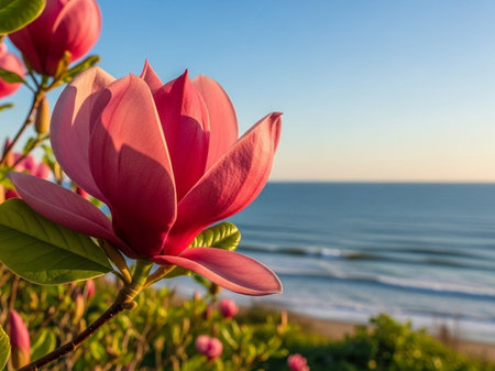 Magnolia flower on the background of the sea. Beautiful spring landscape.