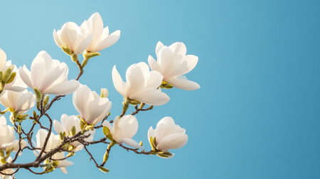 Magnolia flowers against a clear blue sky, soft white petals shining in the sunlight. generative ai