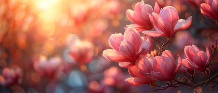 Branch displays pink magnolia flowers bathed in warm soft sunlight