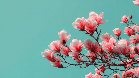 A stunning display of soft pink magnolia blossoms contrasts beautifully against a serene turquoise sky, encapsulating the essence of springtime.