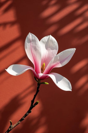 Magnolia flower branch with pink blossoms on white background, minimalistic nature concept