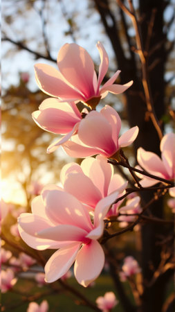 Stunning image of delicate pink magnolia blossoms reaching for a bright sky, symbolizing the beauty of nature and springtime, ideal for floral and gardening visuals.