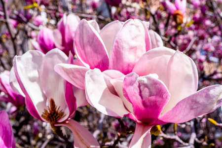 Pink magnolia flower blossoms in the garden under bright April sunlight