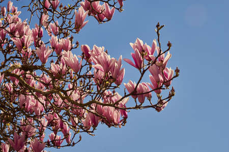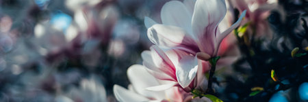 Beautiful Light Pink Magnolia Tree with Blooming Flowers during Springtime in English Garden, UK. Spring floral banner background