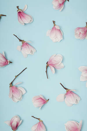 Beautiful pink magnolia flowers on blue background. Top view. flat lay. Spring minimalistic concept