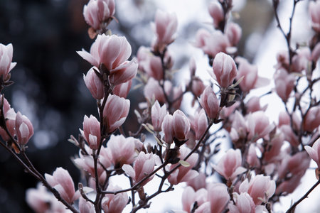 Delicate pink magnolia blossoms capture attention against a softly blurred backdrop. The vibrant bloom flowers gracefully, symbolizing beauty and renewal in spring.
