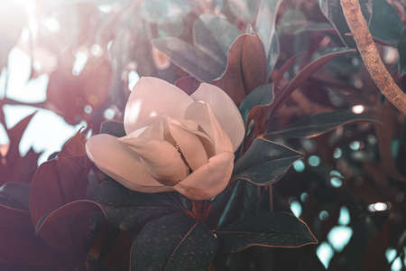 tender ripe white Magnolia flower blooming on a bright green tree with large leaves. Home garden with rare and beautiful plants