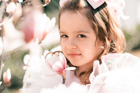 Beautiful smiling kid girl 4-5 year old wear stylish princess dress smell magnolia flower over blooming tree in garden outdoor. spring season. Childhood. springtime. Happy child with floral nature.