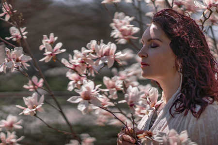 Body parts are female hands.A woman in pale blue clothes holds flowering magnolia branches. Spring is April.