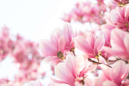 Perfect nature background for spring or summer floral pattern background. Pink magnolia flowers and soft blue sky and sun rays as relaxing closeup. Amazing nature, dreamy flowers