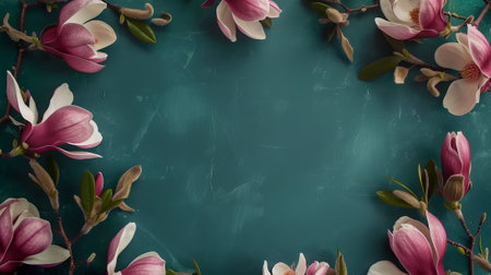 Border frame with magnolia flowers top view on turquoise background with free copy space in center, template for greeting card